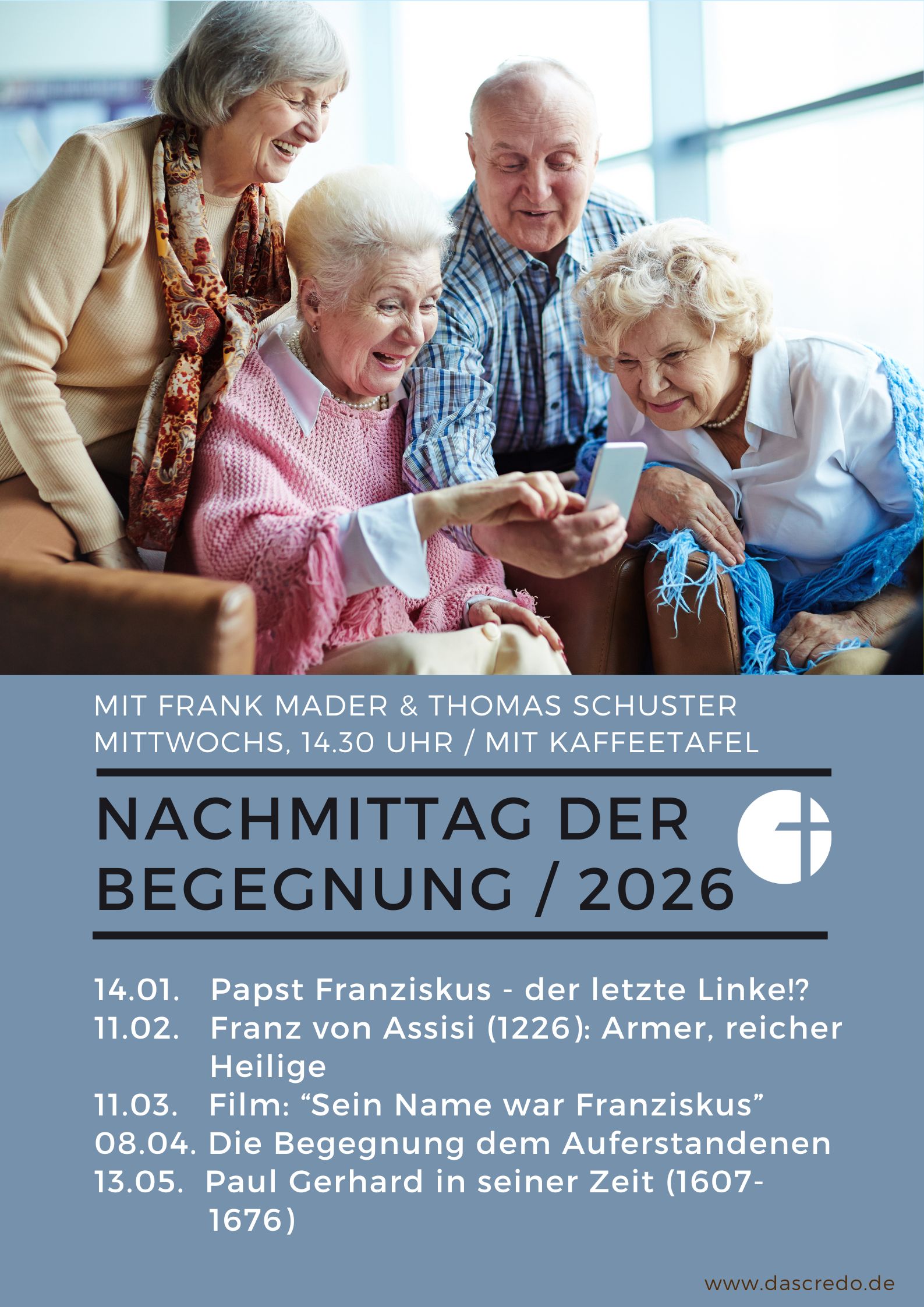 Der Nachmittag der Begegnung ist, ganz unabhängig vom Alter, auch für all jene gedacht, die nachmittags Zeit haben, Gemeinschaft suchen, gerne mit anderen einen Kaffee trinken und ein Stück Kuchen essen. Wir treffen uns einmal monatlich, immer an einem Mittwoch, um 14.30 Uhr im CREDO-Doppelpunkt. Im Mittelpunkt der Treffen stehen neben der Begegnung, interessanten Themen wie etwa Biographien von Menschen des Glaubens oder biblische Texte.
